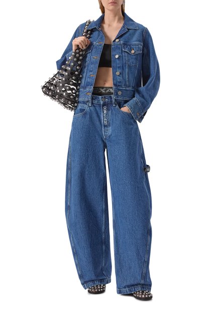 Укороченную джинсовую куртку сшили из денима на основе хлопка, полиамида и лиоцелла. Рукава украсили рельефными логотипами марки. Модель со спущенной линией плеч и двумя накладными карманами с клапанами застегивается брендированными пуговицами.
