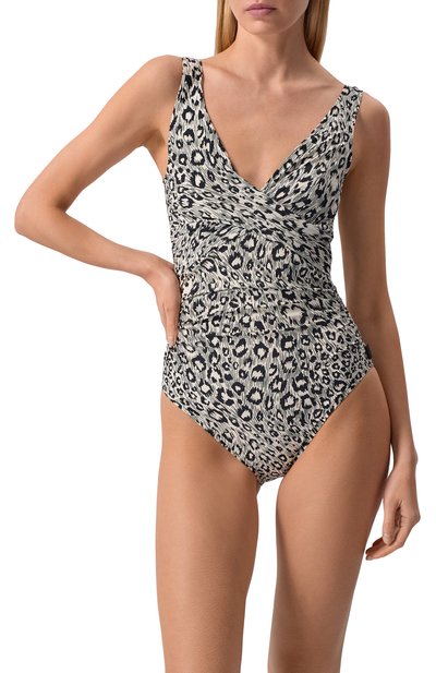 Слитный купальник с фирменными цветными зигзагами сшили из вискозного трикотажа с добавлением нитей ламе. Модель с глубоким V-образным декольте и перекрестными бретелями на открытой спин е дополнили подкладом из нейлона стрейч.