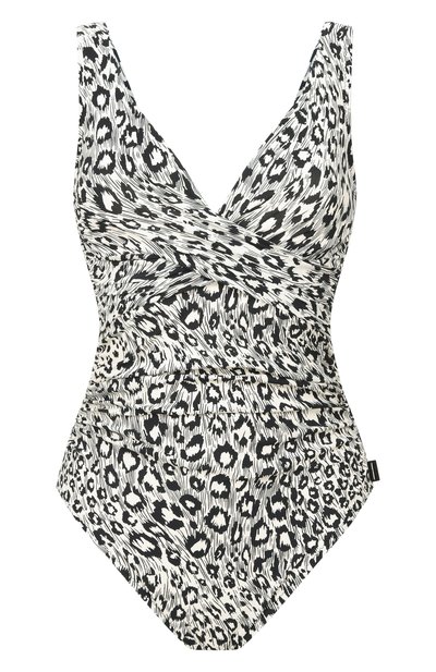 Слитный купальник с фирменными цветными зигзагами сшили из вискозного трикотажа с добавлением нитей ла ме. Модель с глубоким V-образным декольте и перекрестными бретелями на открытой спине дополнили подкладом из нейлона стрейч.