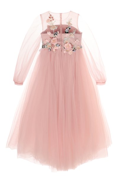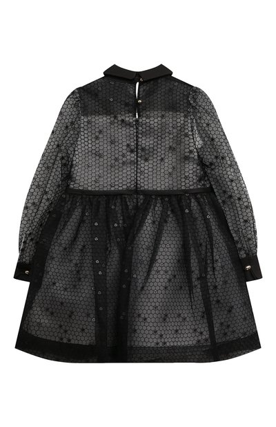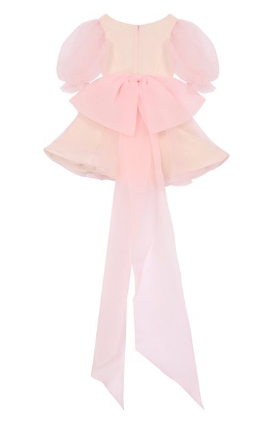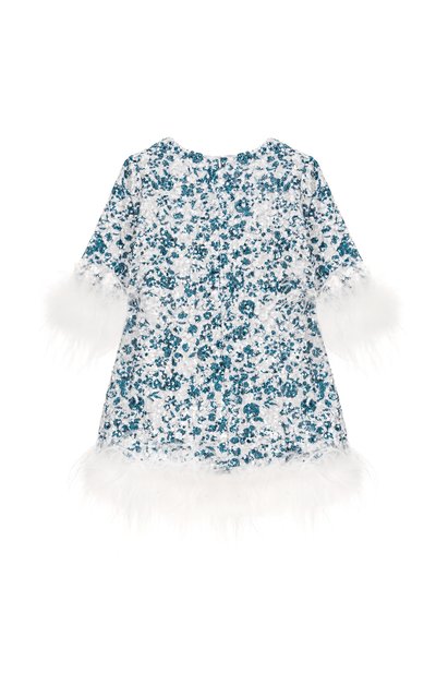 Мини-платье А-силуэта сшили из гладкого атласа Mikado. Модель с деталью, напоминающей накидку, и потайной молнией украсили кристальными медальонами со страусиными перьями.