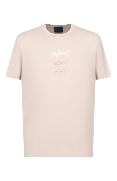 Для изготовления футболки прямого кроя использовали джерси из чистого хлопка. Спереди модель с круглой горловиной декорировали принтом в виде фирменных акул.