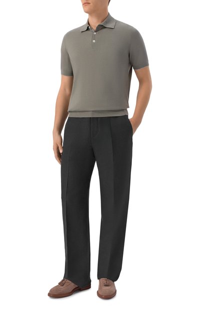Брюки с отутюженными стрелками сшили из хлопкового твила стрейч с добавлением кашемира. Помимо боковых карманов предусмотрели потайной монетный и задние с клапанами на пуговицах.