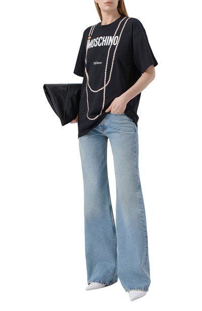 Футболку свободного кроя выполнили из хлопкового джерси. Спереди модель декорировали крупным логотипом и принтом в виде гуся в фирменных туфлях и длинных жемчужных бусах.