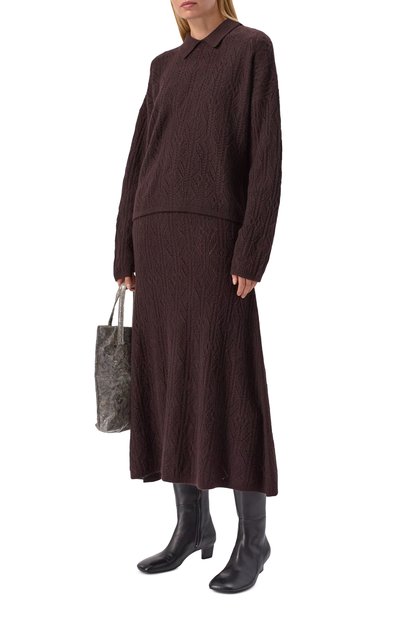 Пуловер с геометрическим узором, связанный из монгольского baby-кашемира, вошел в коллекцию Where The Heart Leads, созданную совместно с брендом 1436. Модель с отложным воротником, пуговицей сзади и разрезом на спинке декорировали сбоку фирменной строчкой с длинными нитями.