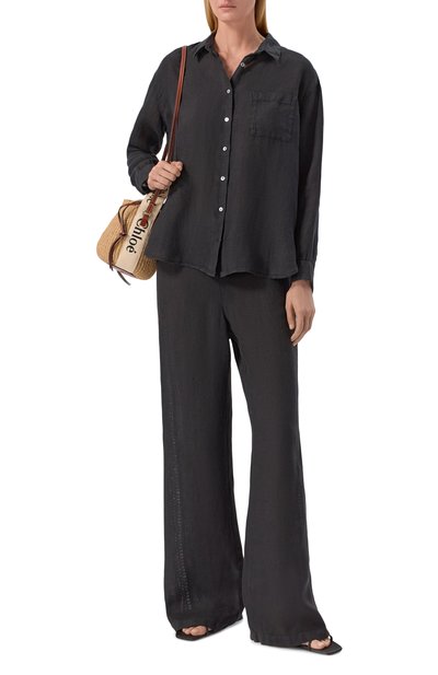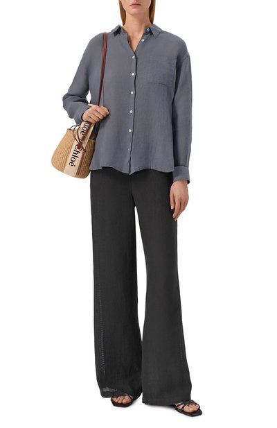 Рубашку с закругленной линией низа и разрезами по бокам выполнили из немного просвечивающей льняной ткани. Свободную модель с отложным воротником и бантовой складкой сзади дополнили нагрудным карманом.