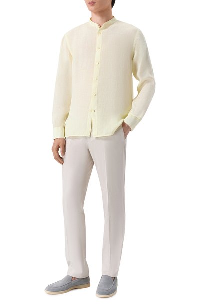 Рубашку с закругленной линией низа выполнили из немного просвечивающего льна. Сама модель с отложным воротником, как и манжеты, застегивается перламутровыми пуговицами.