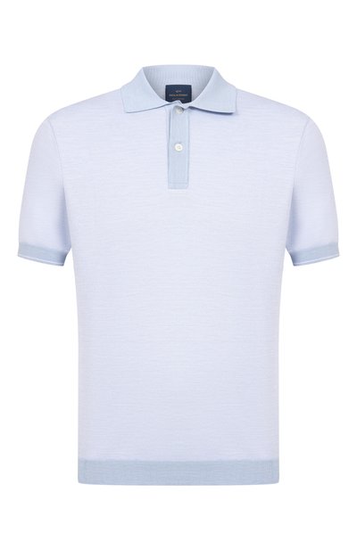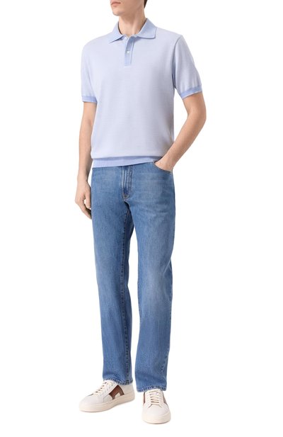 Поло с короткой пуговичной планкой сшили из фактурного хлопкового трикотажа с добавлением шелка. Манжеты коротких рукавов подчеркнули контрастным кантом.