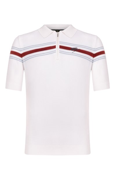 Поло с горизонтальными полосами и отделкой в рубчик украсили вышитым логотипом спереди. Модель из трикотажа на основе хлопка и шелка застегивается короткой молнией с фирменным пуллером.