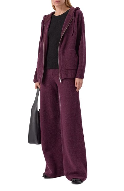 Толстовку с накладными боковыми карманами выполнили из буклированного трикотажа, в котором соединили тонкие волокна кашемира и полиамида. Модель со спущенной линией плеч и регулируемым капюшоном составит комфортный образ с парными брюками и топом.
