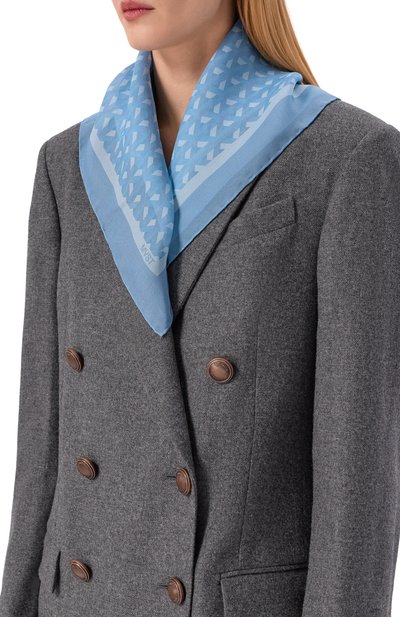 Платок с абстрактным геометричным мотивом выполнили из шелкового крепа. На принадлежность аксессуара бренду указали логотипом в одном из углов.