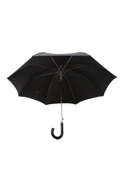 Купол зонта-трости с восемью спицами выполнили из полиэстера с графичным мотивом в тон. Изогнутую ручку с брендированным основанием подчеркнули плетеной отделкой.