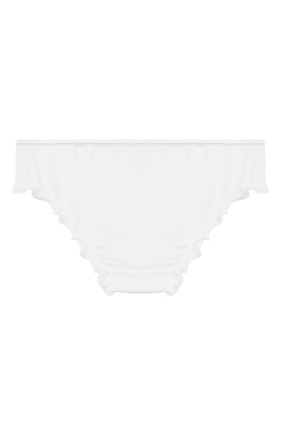 Трусы-слипы с оборками вдоль вырезов выполнили из эластичного трикотажа на основе модала. Узкий пояс с золотистой строчкой декорировали атласным бантом спереди.
