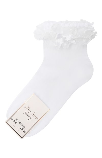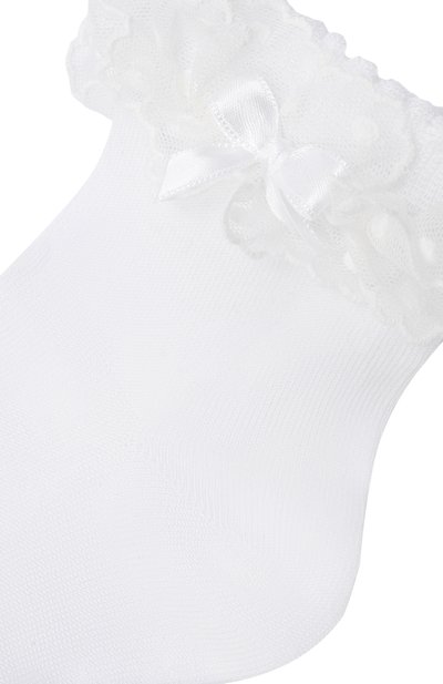 Для создания носков с усиленными зонами нагрузки использовали мерсеризованный хлопок Fil d’Ecosse, укрепленный полиамидом. Фестончатую манжету украсили тюлевой оборкой с атласным бантом.