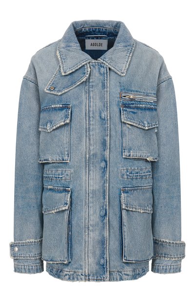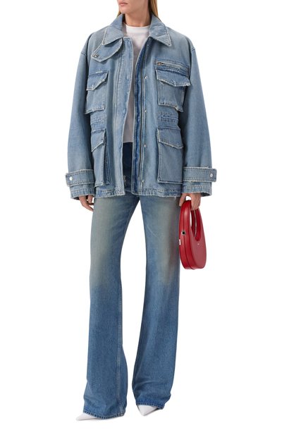 Выбеленную джинсовую куртку с прямоугольными манжетами и складкой сзади дополнили четырьмя накладными карманами. Модель из органического хлопка украсили объемными бантами.