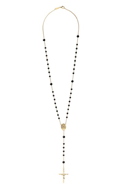 Напоминающее четки колье Kim в виде цепочки со вставками из бусин изготовили из латуни. Аксессуар дополнили овальным медальоном с гравировкой и подвеской в виде креста.