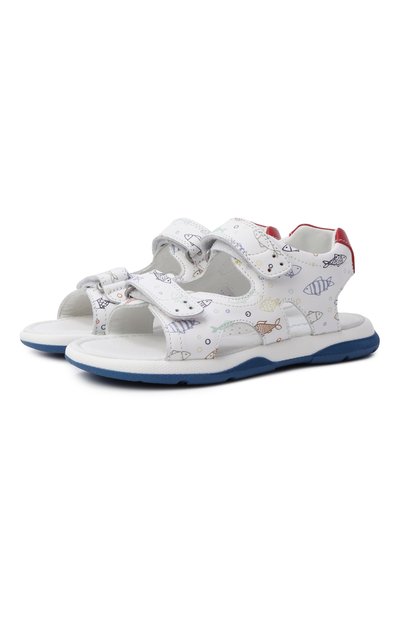 Сандалии New River из гладкой кожи украсили морским принтом. Модель с перфорированным супинатором и двумя ремешками-велкро поставили на гибкую протекторную подошву, выполненную по технологии Sand Effect.
