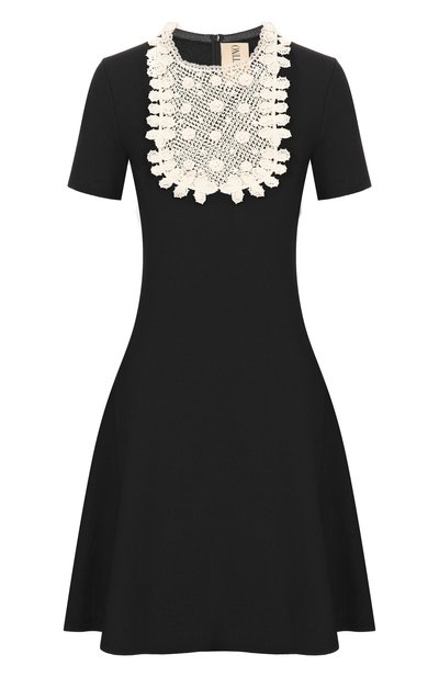 Приталенное платье с драпированным лифом и рукавами «фонариками» сшили из шелка в мелкий горох. Оборки на плечах и вырезе, как и баску с бантами, выполнили из органзы. Модель застегивается потайной молнией сзади.