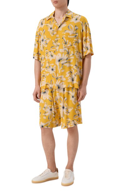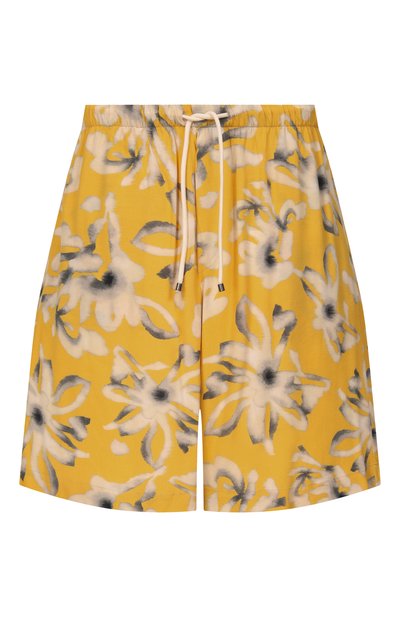 Шорты выполнили из вискозы с абстрактным цветочным принтом. Свободную модель с регулируемым поясом-кулиской дополнили тремя карманами.