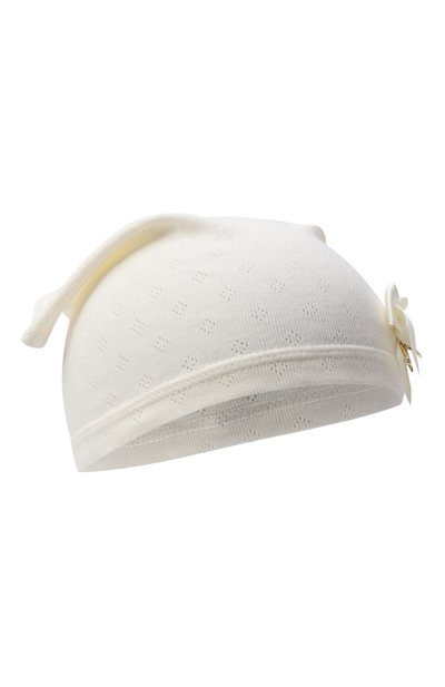 Бандану с ажурным узором изготовили из хлопкового трикотажа пуантель. Аксессуар с плоскими швами украсили атласным бантом с двумя фигурными подвесками: бабочкой, инкрустированной кристаллами, и фирменным брендированным сердцем.