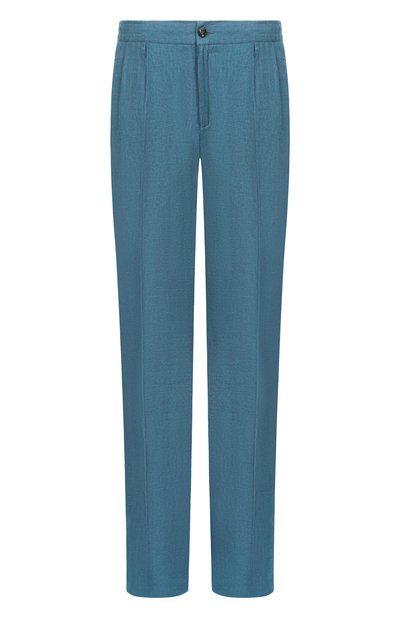 Брюки с парными защипами под эластичным поясом сшили из чистого льна. По бокам и сзади модель со стрелками дополнили врезными карманами с листочками.