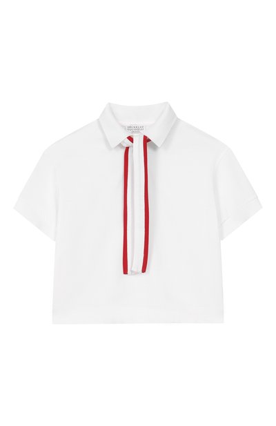 Поло с отложным воротником изготовили из хлопкового трикотажа. Из такого же материала выполнили входящий в комплект узкий шарф с контрастным кантом.