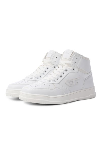 Высокие кеды S-Cou с перфорацией на союзке и текстильным подкладом выполнили из полимерного материала, напоминающего гладкую кожу. Пару с молнией на внутренней боковой панели декорировали патчем с логотипом на язычке и аппликацией-эмблемой сбоку.