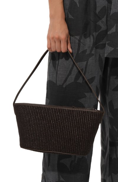 Для создания трапециевидной сумки использовали гладкую телячью кожу. Крепления длинной ручки украсили фирменными цепочками мониль. В комплект входит небольшой съемный футляр.