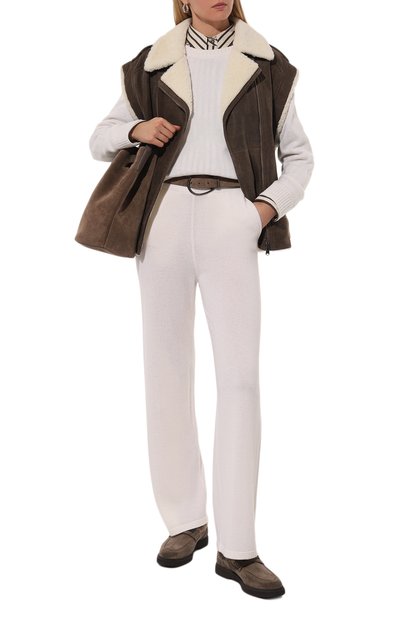 Укороченный жилет с двумя прорезными карманами и трикотажным поясом сшили из овчины Fuzzy с кожаной внешней стороной и коротковорсовым мехом внутри. Пуллер встречной молнии, застегивающей отложной воротник наглухо, украсили цепочкой мониль.