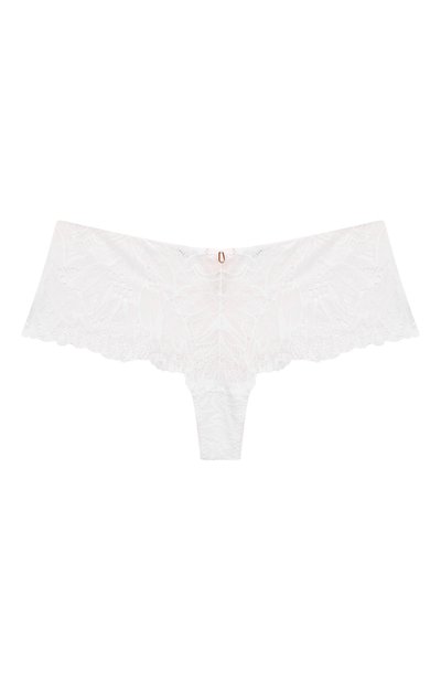 Белые трусы со средней посадкой и фестончатыми краями сшиты из мягкого кружева с нежным цветочным мотивом. Приятный на ощупь материал хорошо пропускает воздух, а тщательно обработанные швы комфортно ощущаются кожей на протяжении в сего дня. Почти невесомая модель украшена спереди и сзади золотистыми шармами.