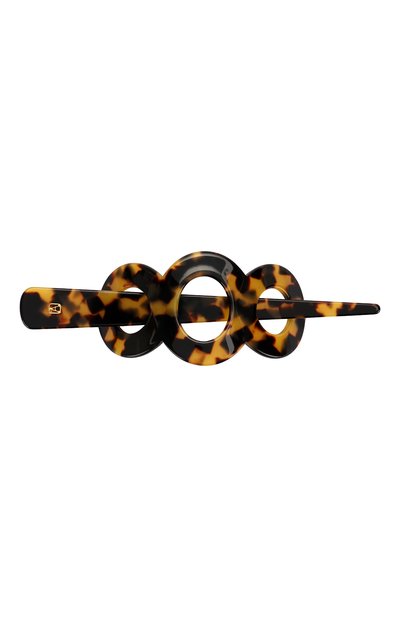 Коричневая заколка изготовлена из легкого глянцевого родоида с черепаховым узором. Аксессуар состоит из двух частей: длинного остроконечного стержня и элемента в виде трех колец, соединенных между собой.