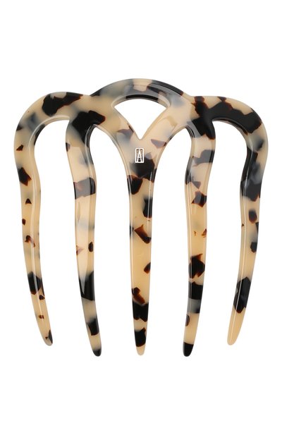 Бежевый гребень с длинными зубцами изготовлен вручную из глянцевого ацетата с мраморным эффектом. Украшенный миниатюрной эмблемой марки аксессуар надежно фиксирует волосы в прическе и позволяет как сформировать небрежный французский пучок, так и закрепить локоны распущенных волос.