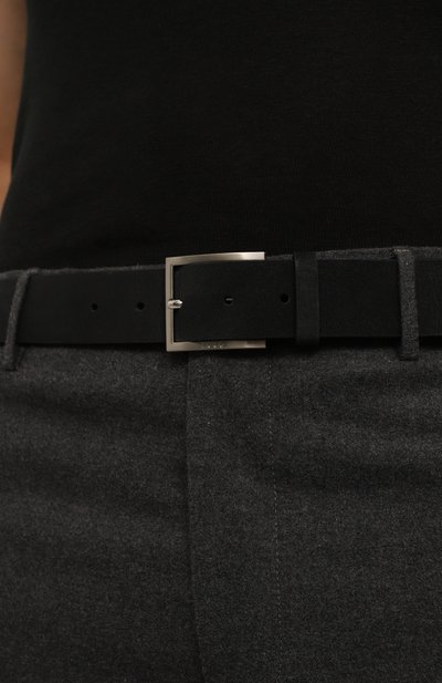 Длинный черный ремень мастера марки выполнили из прочной гладкой кожи, отполированной до легкого блеска. Модель дополнена лаконичной прямоугольной пряжкой серебристого оттенка. Изделие декорировано строчкой ярко-красного цвета и тисненым логотипом бренда. Свободный конец аксессуара можно заправить в шлевку.