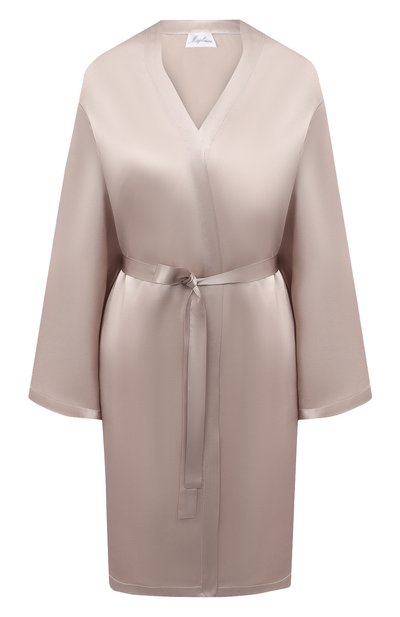 Для пошива серебристо-серого халата мастера марки использовали тонкий нежный сатин с характерным блеском. Материал соткали из гладких шелковых волокон, которые славятся своей нежностью, поэтому изделие практически не ощущается на коже. Из этой же ткани выполнили и длинный пояс в тон.
