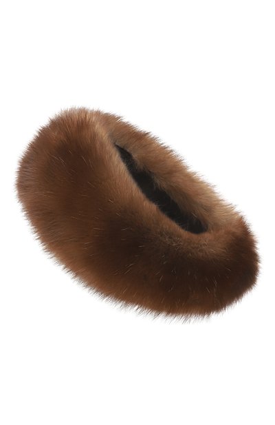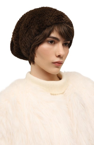 Дизайнеры бренда вывели эту шапку бини на новый уровень за счет материала. Вместо традиционной для таких вещей пряжи аксессуар связали из узких полос меха норки, сделав головной убор необыкновенно нежным и теплым. Пушистый бежевый помпон оттеняет спокойный цвет горького шоколада.