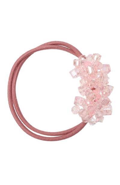 Розовая резинка разнообразит любой комплект за счет декора. Два эластичных жгута скрепили композицией из круглых и квадратных граненых кристаллов, которые эффектно мерцают под разными углами освещения. Аксессуар не спутывает волосы, не доставляет дискомфорта коже головы, но при этом надежно фиксирует прическу.