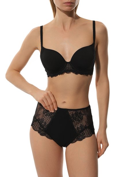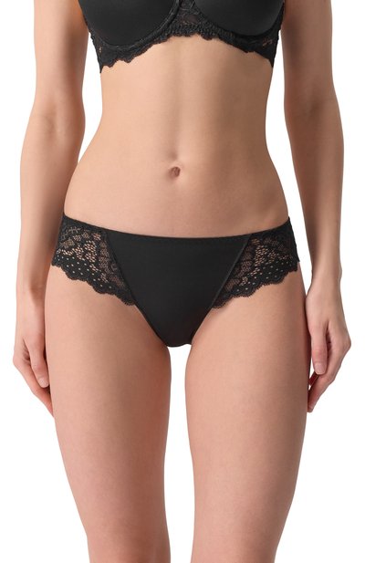 Мастера марки использовали для создания черных слипов нежную шелковистую микрофибру. За счет стрейчевых волокон в составе материала трусы плотно облегают бедра и при этом почти не ощущаются на теле. Чувственность модели добавляют вставки из изысканного кружева с цветочным мотивом, вышитым по полупрозрачному тюлю.