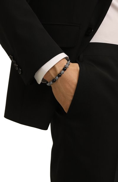 Для изготовления браслета из коллекции «Взгляд с Востока» использовали круглые бусины из темного агата и объемные серебряные шармы с замысловатым резным узором и миниатюрными кабошонами из полированного оникса. Детали нанизали на прочный шелковистый шнур, из которого сформировали скользящий узел, позволяющий регулировать посадку на запястье.