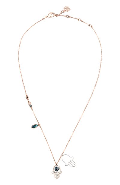 Фигурный кулон в форме руки одинаково гармонично впишется в образы как с коктейльным платьем, так и с простой футболкой и джинсами. Для создания украшения с тонкой цепочкой мастера марки использовали комбинацию металлов двух оттенков: серебристого и цвета розового золота. Модель инкрустирована небольшими сверкающими кристаллами.