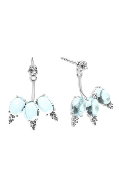 Эти небольшие серьги – аксессуар 3-в-1: благодаря съемному декору из них можно собрать асимметричный сет или носить как пусеты. Для изготовления модели мастера марки использовали серебро 925 пробы с родиевым покрытием. Его холодное сияние усиливают прозрачные кристаллы драгоценной огранки. Подвески, которые располагаются за мочкой уха, инкрустировали крупными овальными топазами бледно-голубого цвета.