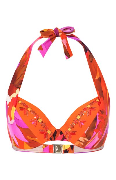 Для пошива бра использовали тонкий эластичный полиамид. Материал высыхает почти мгновенно, не выгорает на солнце и не теряет форму под воздействием соленой или хлорированной воды. Уплотненные чашечки обеспечивают оптимальную поддержку груди и слегка приподнимают ее. Разноцветный принт, выполненный в ярких тонах, дополняет растительная вышивка.