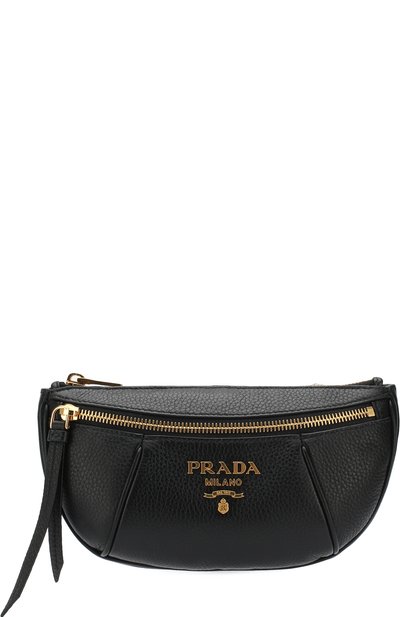 В сезоне весна-лето предлагаем включить в свой репертуар черную поясную сумку. Небольшой аксессуар с широким регулируемым ремнем изготовлен из зернистой матовой кожи. Внешний карман, как и основное отделение, застегивается на молнию. Модель украшена рельефным золотистым логотипом бренда, основанного семьей Прада. Внутрь поместятся ключи, смартфон и паспорт.