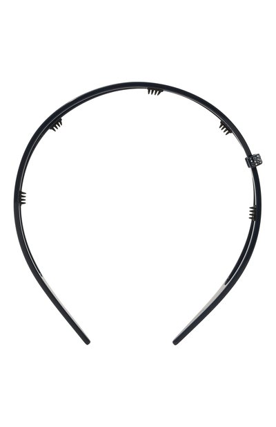 Черный ободок будто собрали из узких лент, подчеркнув точку пересечения небольшой вставкой с мерцающими кристаллами. Для изготовления аксессуара использовали легкий глянцевый ацетат. С внутренней стороны модели предусмотрели миниатюрные гребни, поэтому она надежно фиксирует прическу, не повреждая волосы.