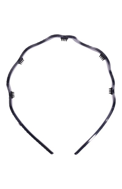 Узкий синий ободок выполнили из легкого, но прочного ацетата, на котором закрепили сверкающие кристаллы Swarovski, подчеркивающие скульптурную форму аксессуара. Чтобы изделие не скользило по волосам, с внутренней стороны его дополнили небольшими заостренными зубцами, как у гребня.