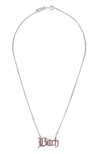 Крупную горизонтальную подвеску в виде надписи Bitch в готическом стиле выполнили из серебристого бижутерного сплава с холодным блеском. Аксессуар инкрустировали розовыми миниатюрными кристаллами, яр ко сверкающими в лучах света. Карабин цепочки, на которой закрепили модель, украсили круглой деталью в виде эмблемы.