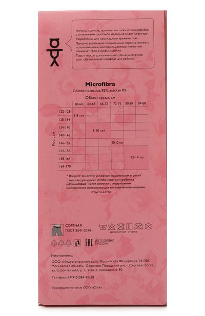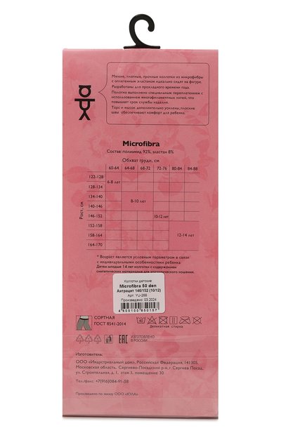 6/8А: рост 128-134 см, обхват груди 60-64 см; 8/10А: рост 134-146 см, обхват груди 64-72 см; 10/12А: рост 146-152 см, обхват груди 72-76 см; 12/14А: рост 152-164 см, обхват груди 80-88 см.