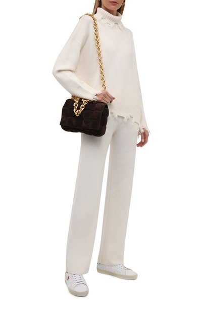 Свободный кремовый свитер – уютный вариант для прохладной погоды. Для изготовления модели с высоким воротом и спущенной линией плеч мастера марки использовали нежный кашемир. Изделие из такого материала окутывает легким теплым облаком и исключительно приятно ощущается на теле.