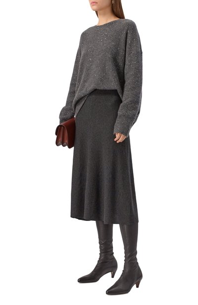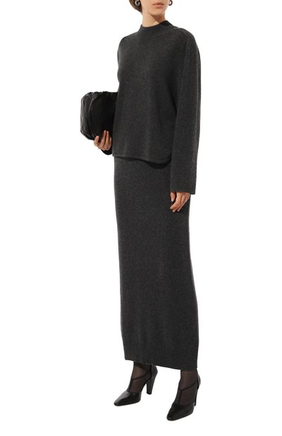 Для изготовления темно-серого свитера с высоким воротом мастера марки использовали тонкую кашемировую пряжу. Ее произвели из нежного шелковистого пуха горных коз, поэтому модель получилась особенно приятной на ощупь и невероятно теплой, а благодаря свободному крою она окутывает тело, не сковывая движения.