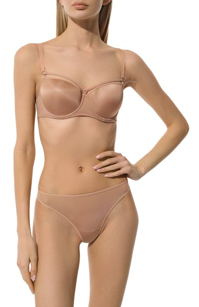 Бежевый бюстгальтер выполнили из мягкой эластичной микрофибры с шелковистым блеском. Плотные чашечки на косточках с эффектом пуш-ап подчеркнули конструкцией из узких ремешков, закрепленных на золотистой брендированной деталью на перемычке. Посадку модели позволяют отрегулировать бретели со скользящими слайдерами.