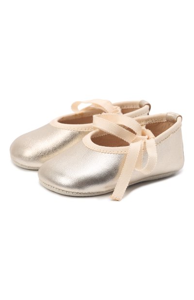 Дизайнеры бренда в равной степени позаботились о комфорте ребенка и об эффектном внешнем виде пинеток. Модель стилизовали под пуанты: верх из гладкой и пластичной золотистой кожи, напоминающей мерцающий атлас балетных туфель, дополнили кремовыми лентами грогрен, которые надежно фиксируют стопу.