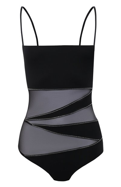 Черный цвет задает тон этому купальнику, но он не выглядит скучно: все дело в полупрозрачных вставках (они подчеркнуты сверкающими стразами). Для создания модели мастера марки использовали мягкий эластичный текстиль. Материал не деформируется и не выцветает на солнце, поэтому вещь надолго сохранит свежий вид.